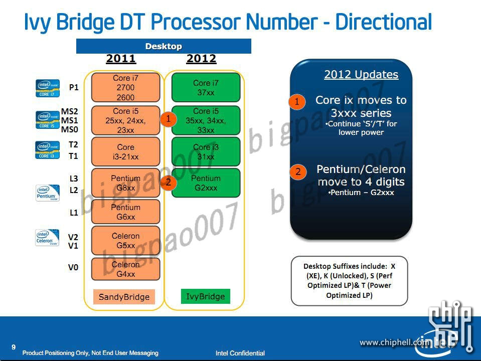 La nomenclatura dei nuovi processori sarà molto simile alla attuale, fatto salvo il primo numero del modello specifico. Avremmo infatti la famiglia Core i7-37xx, Core i5-35xx, 34xx e 33xx, Core i3-31xx e Pentium G2xxx. Verranno contraddistinte le versioni a basso consumo con il suffisso S o T, come è in uso tuttora.